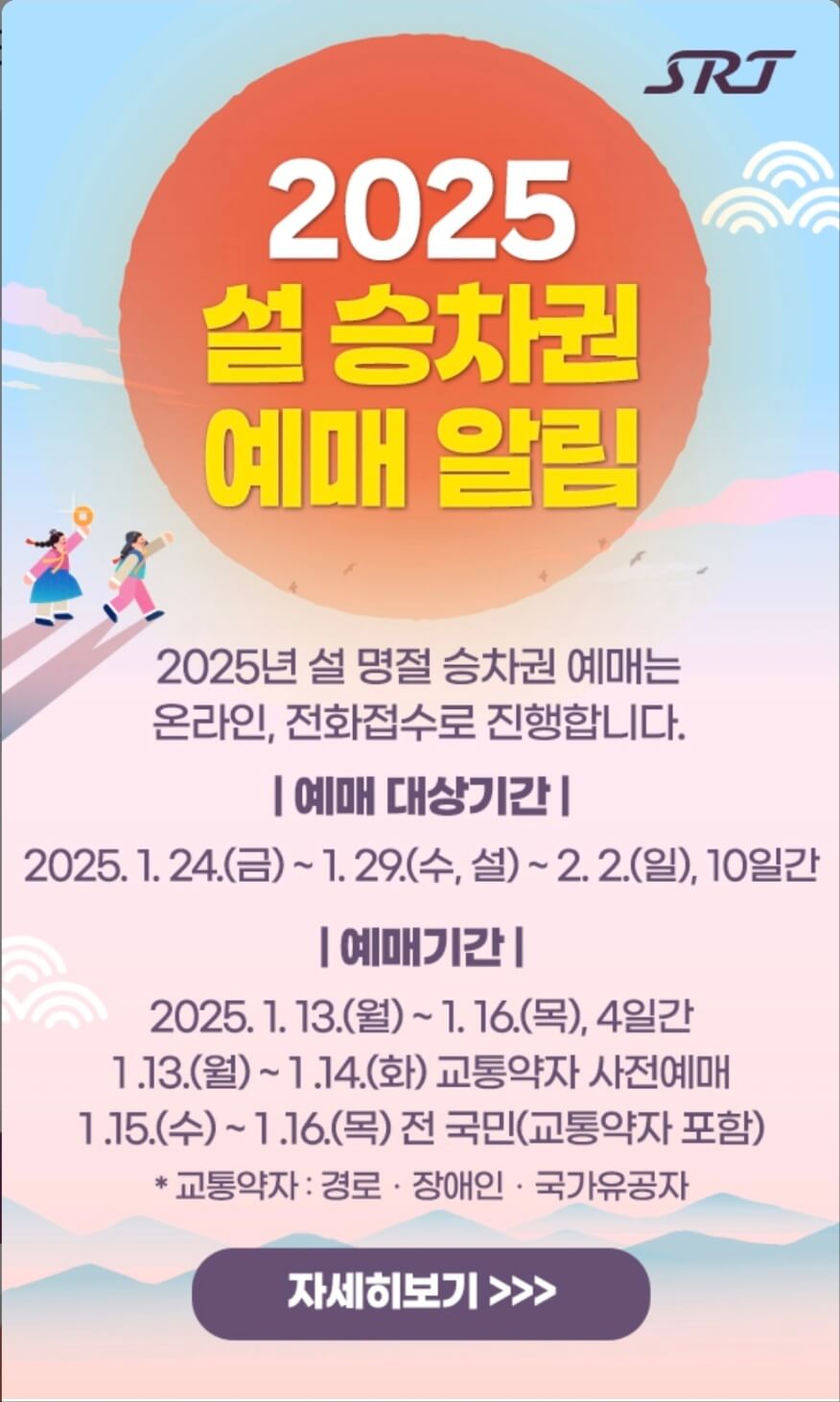- 예매기간 : KTX : 2025. 1. 6 - 1. 9 / SRT : 2025. 1. 13 - 1. 16